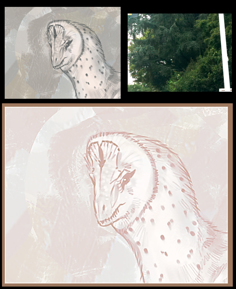 I needed to add something into the foreground so I didn't end up with some stupid floating head. Looking at more owl photos helped me get a better idea of the subtleties in their patterns. an overlay and color-dodge layer let me add in a sunset, then I sketch more colors in to blend it. At this point I mostly just shrink a brush down, take the tapering off and sketch away like a color-pencil while trying to preserve some of the more appealing brushstrokes.