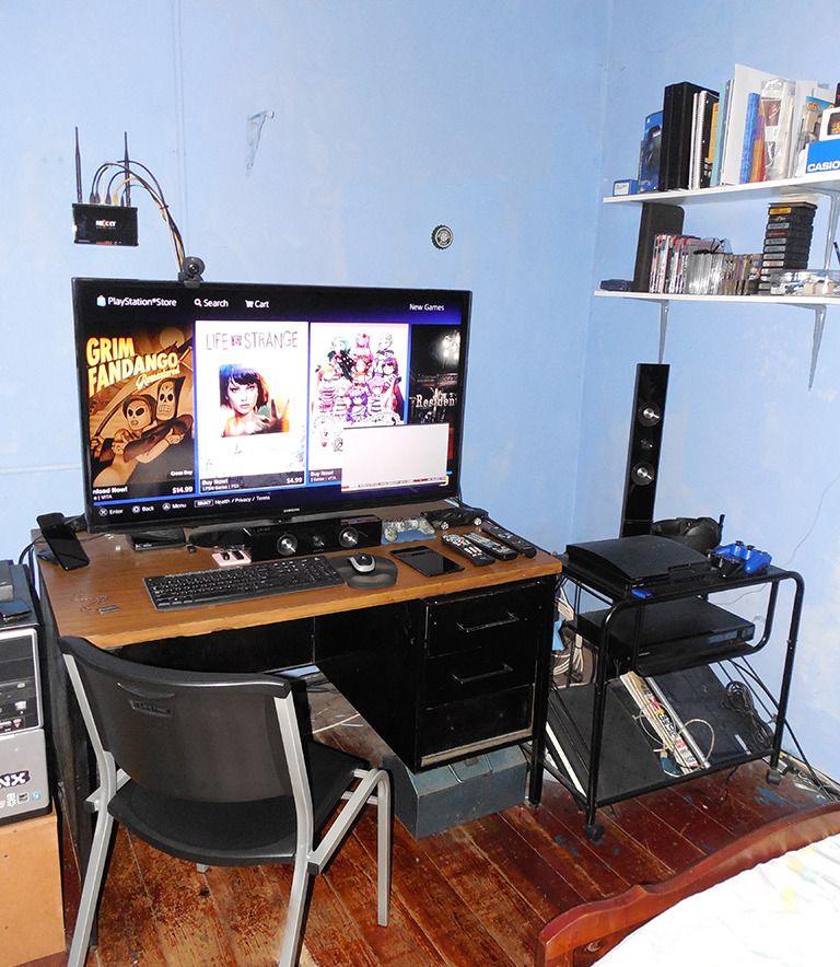 Here is my current setup. My apartment is pretty small and crappy so all my gaming stuff is in this corner.
