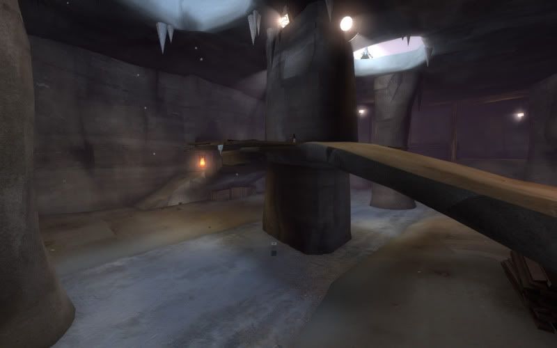 Got plenty of space, should be a fun map. Interestingly the ice makes a noise like a tin roof when you walk on it, to help against deadly spies. Nice little touches of humour, and somewhat reminds me of Metroid Prime with it's chunky stone protuberances and holes.